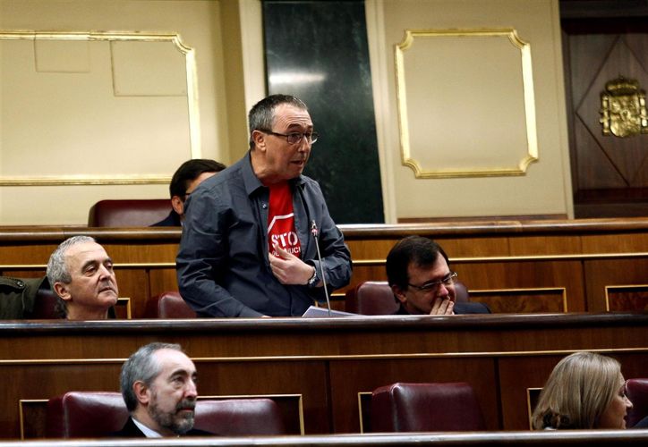 … realizó un simbólico desnudo durante su intervención en la sesión de control al Gobierno cuando le formulaba la pregunta al presidente del Gobierno, … … se quitó la corbata y a continuación comenzó a desabrocharse la camisa con la intención de dejar a la vista una camiseta roja con el lema “Stop desahucios”. …