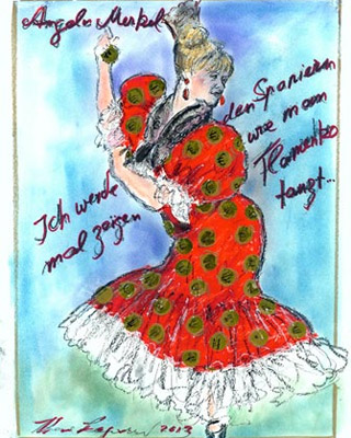 “Les voy a enseñar a los españoles cómo se baila flamenco”. Es la Ángela Merkel de Karl Lagerfeld. El famoso diseñador ha elegido como nueva víctima de sus caricaturas a la canciller alemana, a la que ha vestido de bailaora para el número de abril de la revista del diario Frankfurter Allgemeine Zeitung.